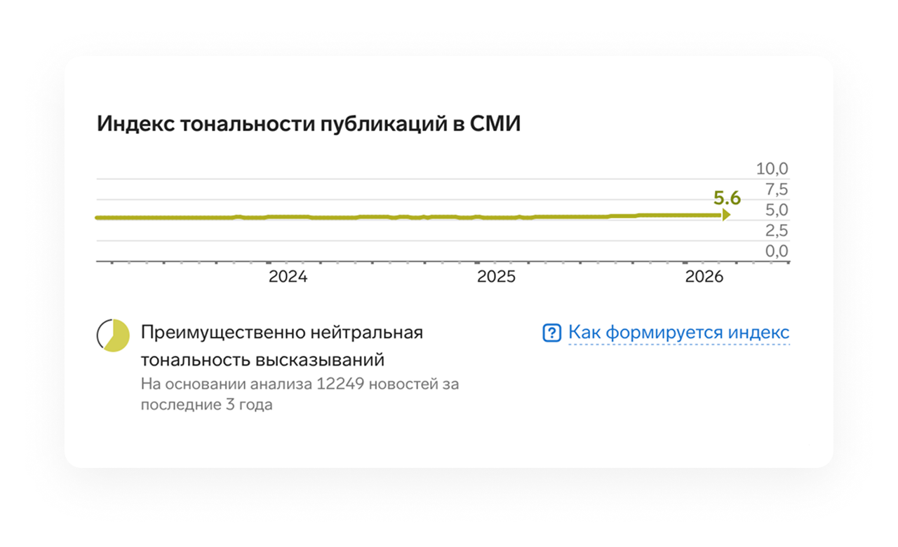 ИИ проанализирует публикаций за последние три года и построит график динамики тональности. Вы увидите общий тренд, периоды роста и спада, значимые изменения.Можно кликнуть на точку и посмотреть публикации, которые повлияли на индекс.
