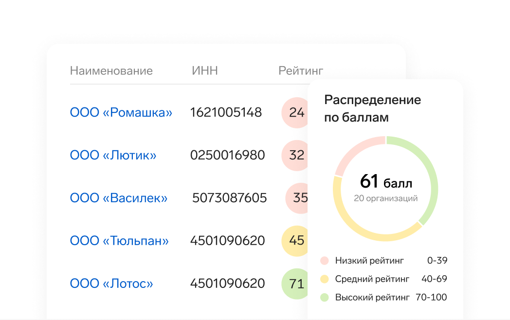 Контур.Фокус покажет рисковые факторы в работе компании, на которые стоит обратить внимание, и выдаст автоматическую оценку благонадежности партнеров по вашим требованиям.