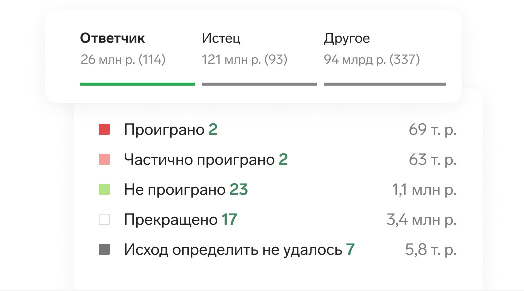 Сервис покажет арбитражные дела партнера за годы его работы, их причины и суммы исков, а еще соберет по ним статистику. Воспользуйтесь фильтрами, чтобы изучать только то, что вам важно. Документы можно скачать.