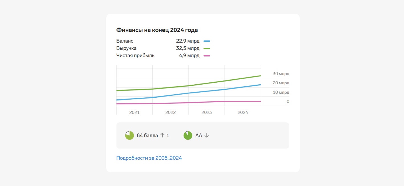 Мы хотели сделать один из важных блоков более привлекательным с точки зрения визуала. Пригласить пользователя к взаимодействию с ним и тем самым мотивировать к более подробному изучению финансов. Многолетняя динамика на сводке дает больше понимания об устойчивости компании, теперь за ней не нужно идти в раздел «Финансы».
