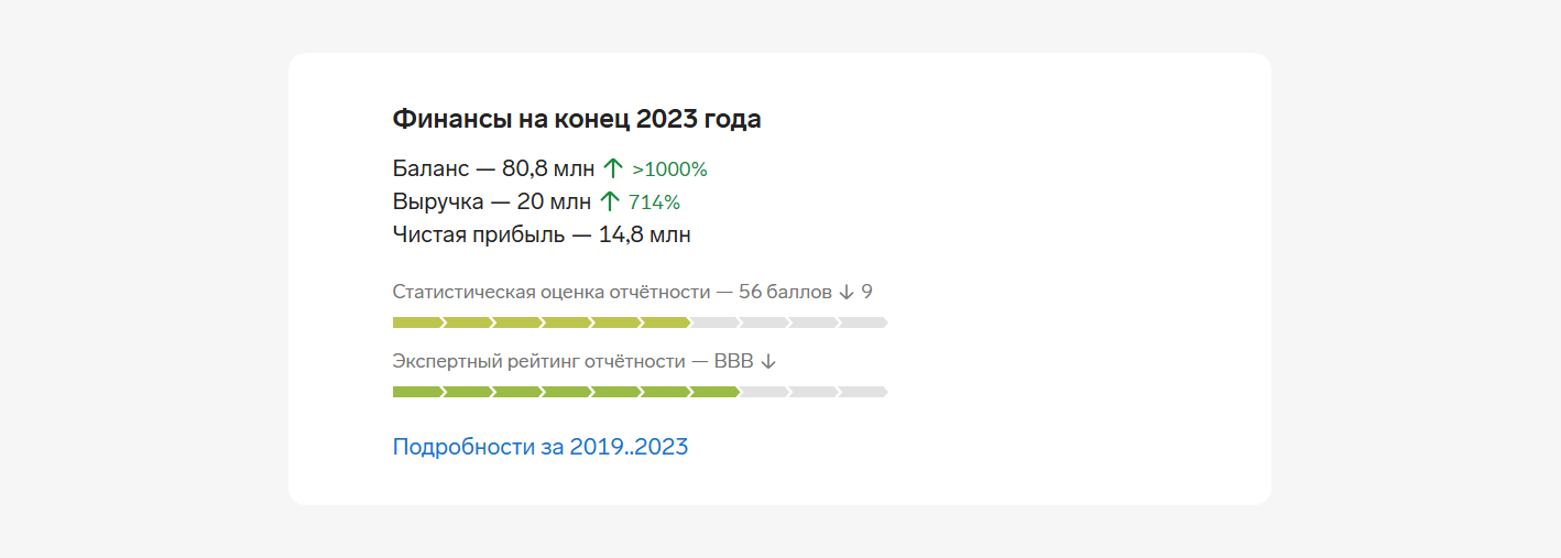 Раньше блок «Финансы» отражал информацию о балансе, выручке и чистой прибыли в рублях, с указанием роста в процентах. Статистическая оценка отчетности и экспертный рейтинг были выражены в виде горизонтальной шкалы.