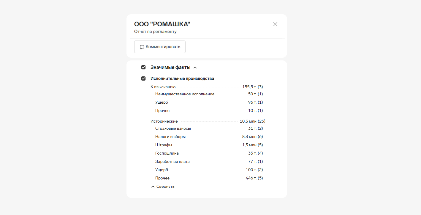 Новый отчет подойдет под задачи компании, в которой есть собственный регламент проверки. Крупные компании часто проверяют контрагентов по определенным регламентам: составляют чек-лист параметров, на которые нужно обратить пристальное внимание. При составлении отчета приходится вручную копировать разные факты о контрагенте из Фокуса. Это занимает много времени и написать развернутый комментарий уже некогда. Если в вашей компании есть регламенты проверки контрагентов и вы сталкивались с проблемой ручного копирования информации — отчет по регламенту вам подойдет.