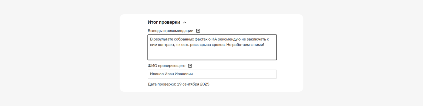 Напишите заключение и укажите автора. Добавьте итоговое заключение по результатам проверки — укажите имя ответственного за составление отчета. Это увеличит доверие к отчету как конечному артефакту и позволит легко определить, кто и какие решения принимал при работе с конкретным контрагентом.