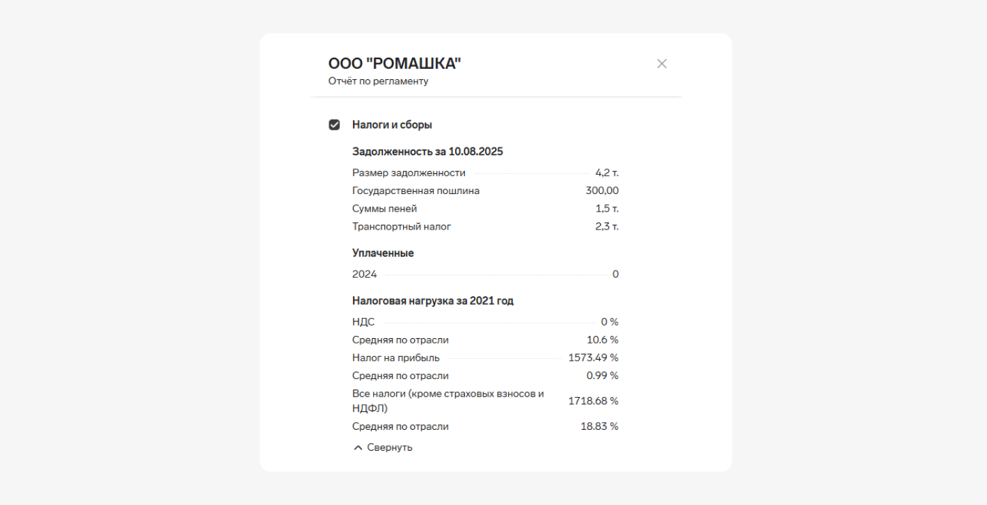 Включите в отчет информацию о налогах. Информация о суммах уплаченных налогов, штрафах и задолженностях помогает точнее оценить финансовое состояние контрагента.