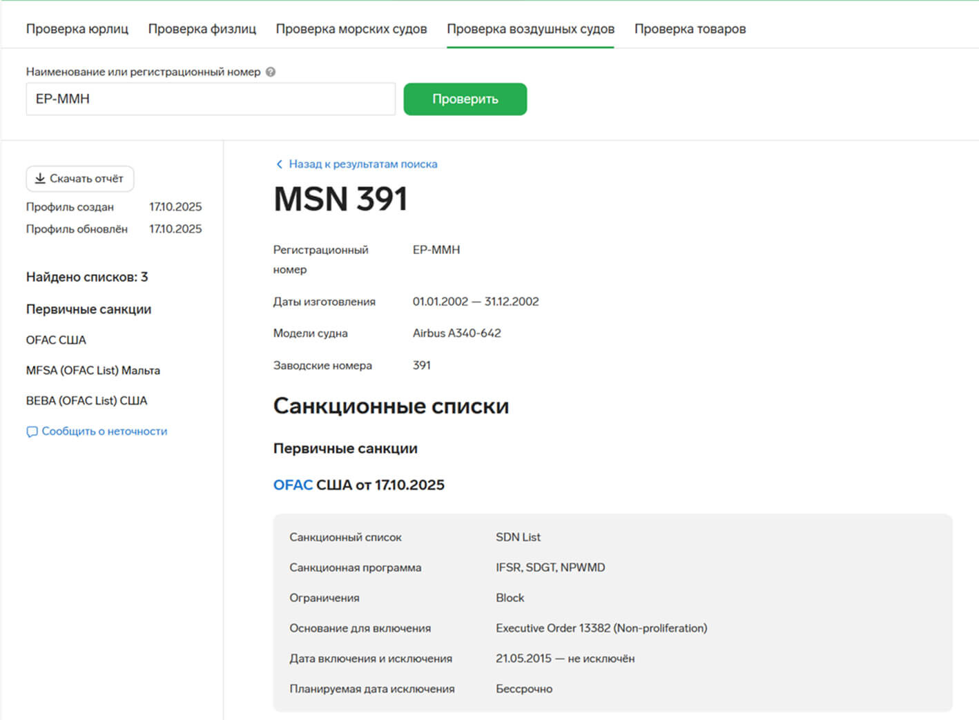 Чтобы проверить борт, достаточно ввести его наименование или регистрационный номер — Фокус.Комплаенс автоматически сверит данные с санкционными списками и покажет совпадение. Сейчас доступны сведения о 336 воздушных судах из источника OFAC (США).
