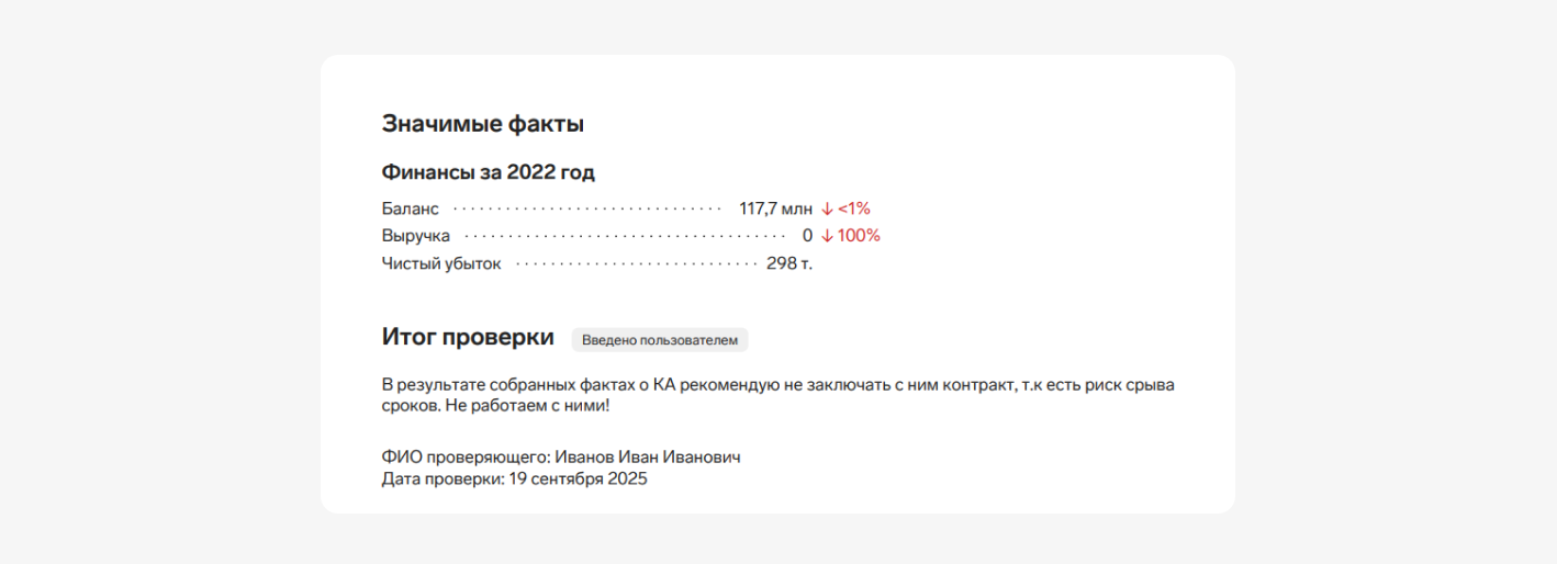 Заключение службы безопасности — это документ, в котором специалисты фиксируют информацию о будущем партнере и оценивают риски сотрудничества. В заключение обычно включают: