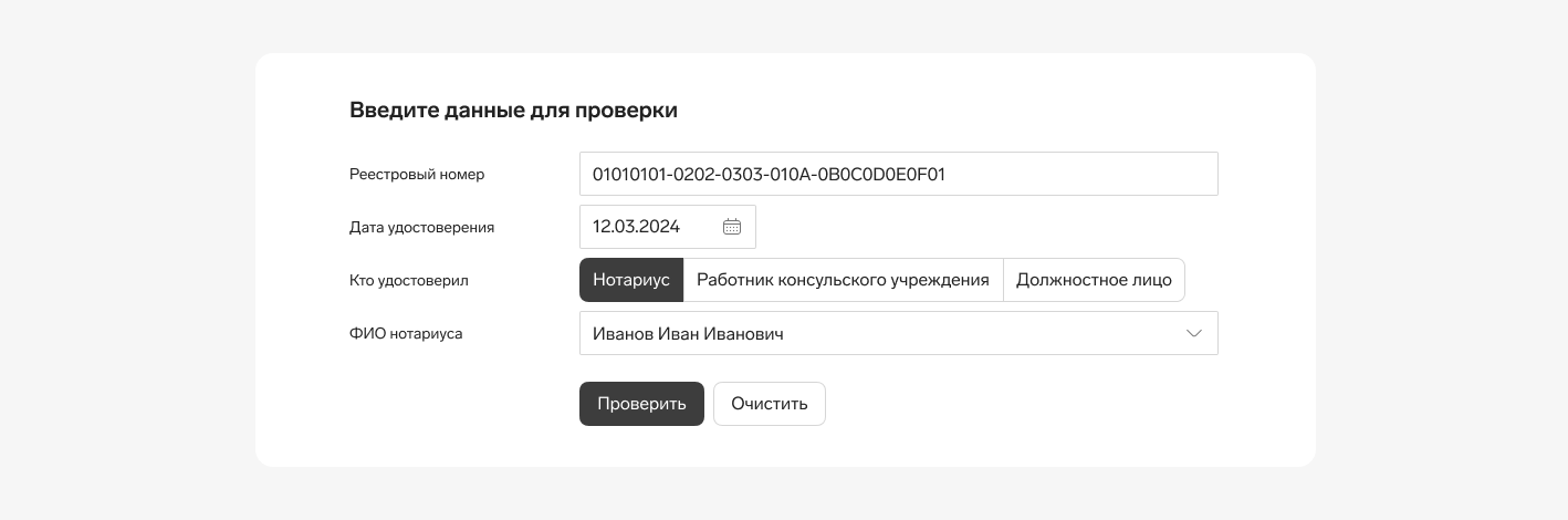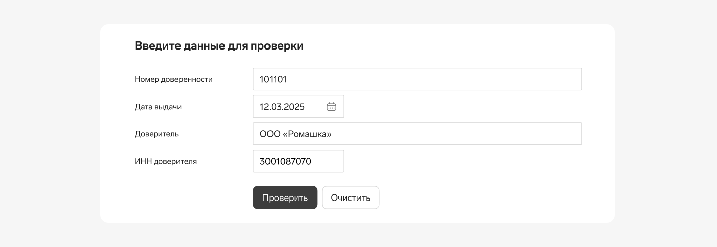 Введите данные в поля и нажмите «Проверить» — сформируется новый запрос на проверку доверенности: