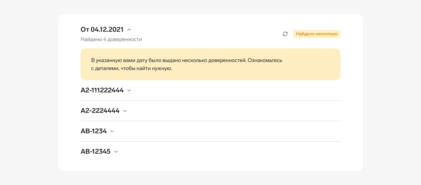 В случае запроса проверки с указанием всех данных о простой письменной доверенности, увеличивается шанс обнаружить отмену искомой доверенности. Однако проверку можно выполнить только по дате выдачи доверенности. Если таких доверенностей будет найдено больше одной, сервис покажет все результаты поиска: