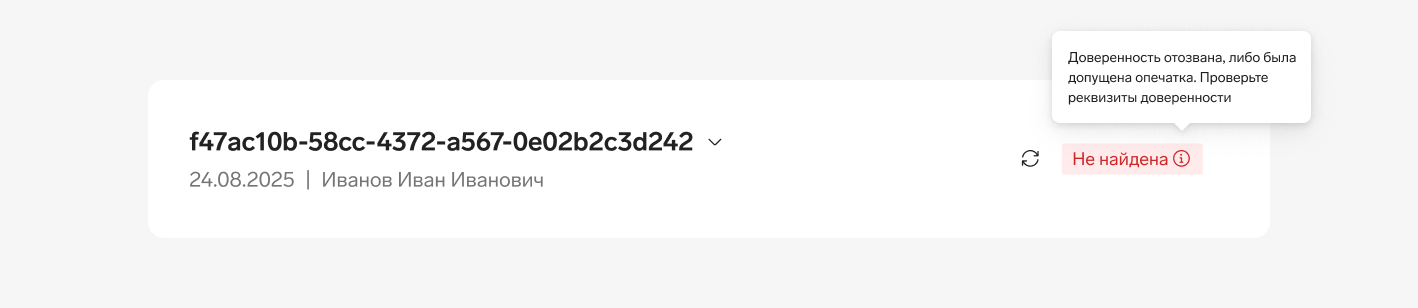 Не найдена. Этот статус может возникнуть в двух случаях: доверенность была отозвана или сервис не нашел доверенность с указанными реквизитами. Возможно, при заполнении данных была допущена опечатка.