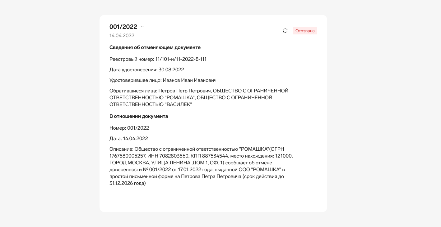 Если сервис обнаружит отмену простой письменной доверенности, проверка завершится в статусе «Отозвана». В подробностях могут быть указаны реквизиты отменяющего и отмененного документа, данные о лицах, обратившихся за отменой доверенности, а также описание отменяемого документа.