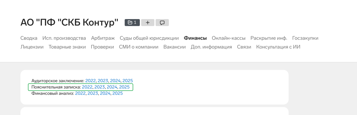 Введите ИНН компании в поиск Фокуса и перейдите на вкладку «Финансы». Теперь там появилась возможность скачать новый тип документа — пояснительную записку.